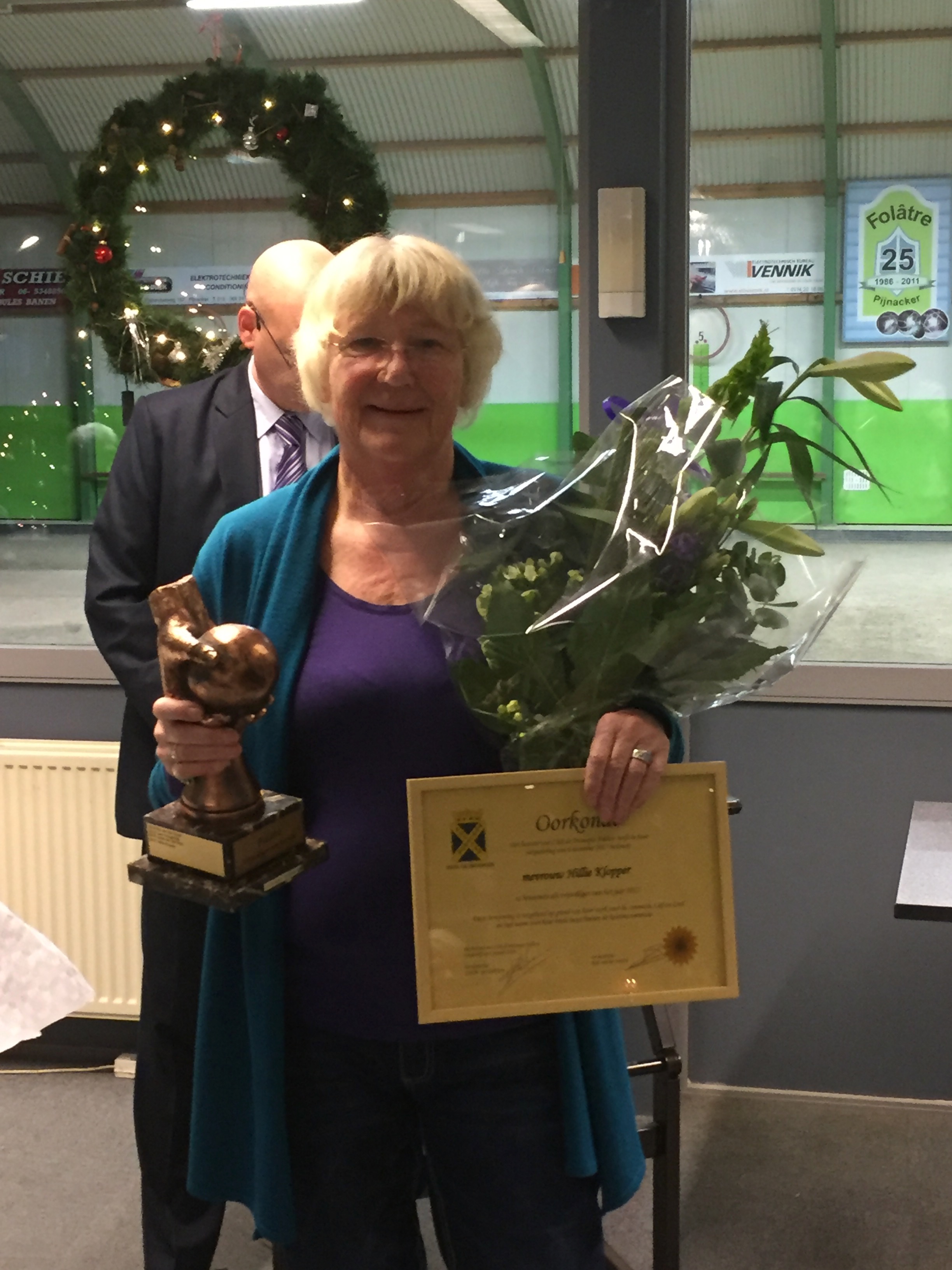 Tot slot werd onder luid applaus de vrijwilliger van het jaar bekend gemaakt. Door haar veelzijdige werk voor de kantine en ook haar betrokkenheid in de commissie “Lief en Leed” werd aan Hillie Klopper onder luid applaus de bokaal en bijbehorende oorkonde overhandigd.
