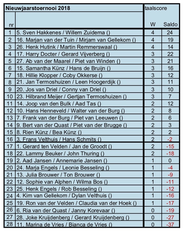 Op zaterdag 6 januari werd het jaarlijkse nieuwjaarstoernooi gehouden met aansluitend de nieuwjaarsreceptie. Een succesvolle formule; dat bleek wel uit het aantal leden dat deze dag de weg naar onze accommodatie namen. Het aantal deelnemende teams aan het toernooi was 28. Zij speelden vier voorgelote wedstrijden die veelal in een gemoedelijke doch serieuze strijd werden gespeeld.