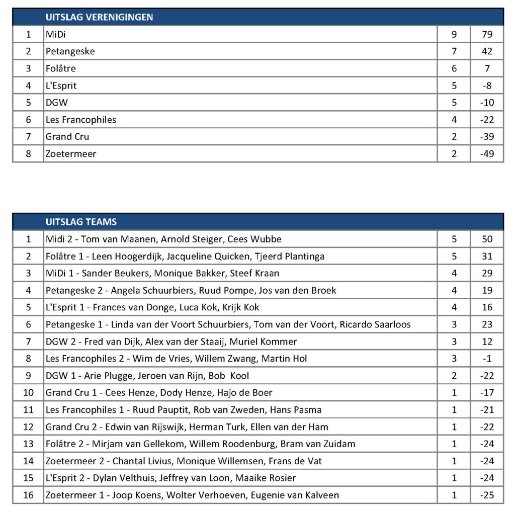 De andere partij was nog bezig. Mocht Petangeske 2 winnen dan was gezien het saldo Folâtre 1 winnaar. Mocht MIDI 2 winnen dan zouden zij winnaar zijn. Met gespannen gezichten werd de laatste partij door de nog aanwezige bekeken. Uiteindelijk trok MIDI 2 aan het langste eind en werd dus ook individueel winnaar.