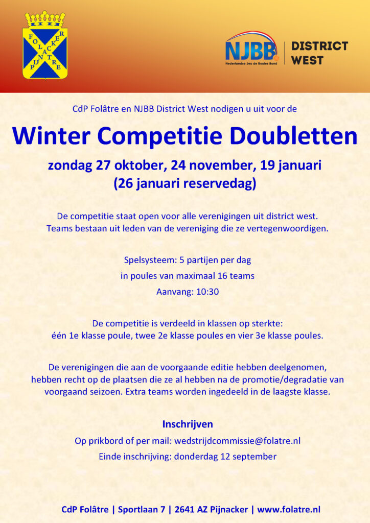 Folatre 4 speelde op 1 november de thuiswedstijd tegen JBC Vlaardingen 5. De eerste doublettenronde werd een partij gewonnen met 13-7. De anderen werden verloren met 8-13 en 12-13 welke laatste gespeeld werd door 2 teamleden die vrijdag de hele dag geholpen hadden met het grind van het dak af halen en allebei nog behoorlijke spierpijn hadden en daardoor eerst met 0-9 achter kwamen en uiteindelijk nog bijna de wedstijd konden winnen.