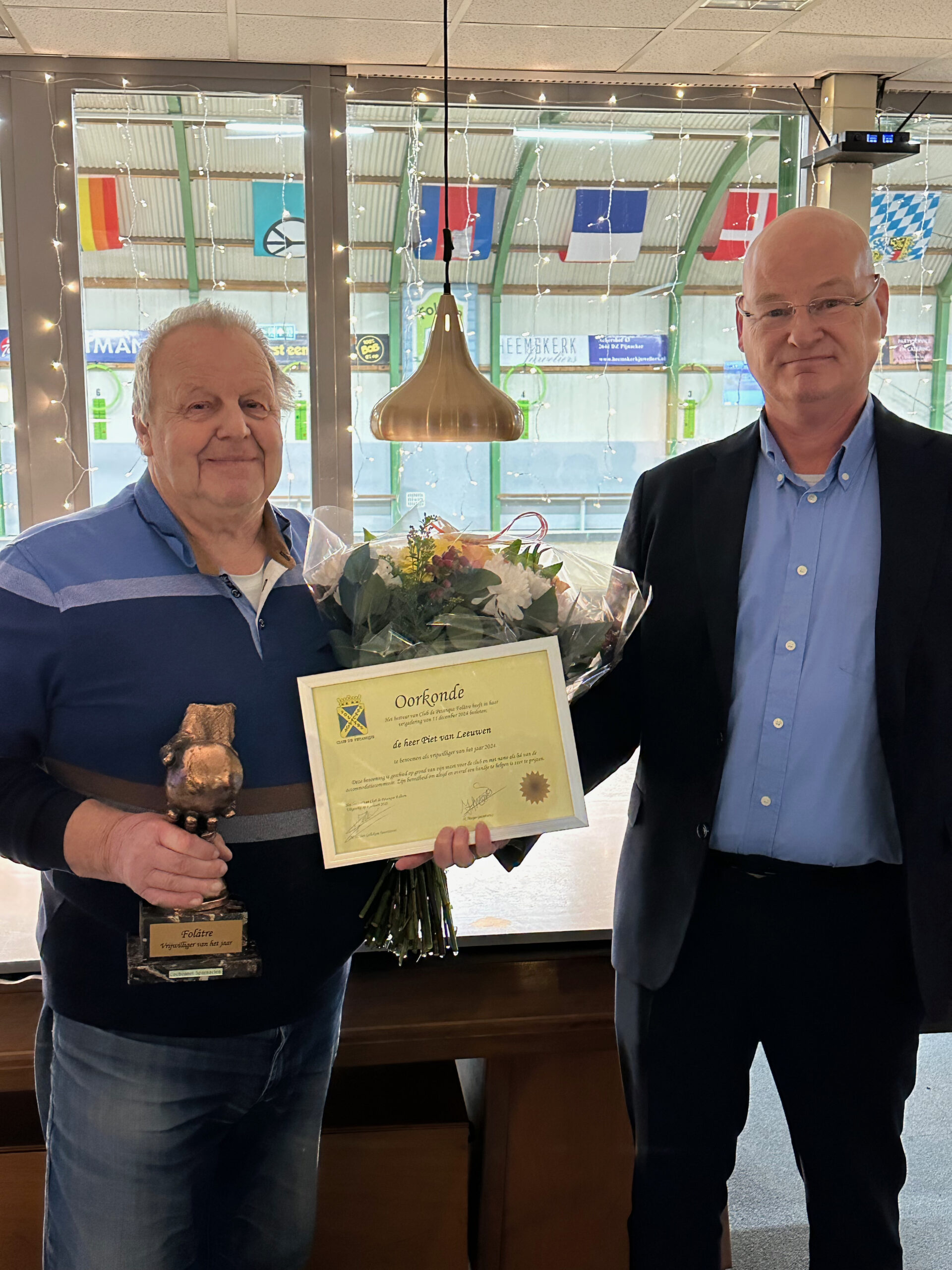 Vervolgens werd de Vrijwilliger van het Jaar bekend gemaakt. Deze benoeming is geschied op grond van zijn inzet voor de club en met name als lid van de accommodatiecommissie. Zijn bereidheid om altijd en overal een handje te helpen is zeer te prijzen. Heel terecht werd de oorkonde, bloemen en bokaal overhandigd aan Piet van Leeuwen!