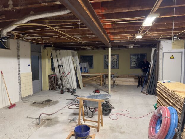 De renovatie van de toiletgroepen loopt volgens plan. Inmiddels is de hele ruimte ontmanteld en kunnen we langzaam gaan beginnen aan de opbouw. Folâtre is ontzettend trots op onze vrijwilligers! Zij verzetten enorm veel werk waardoor wij de kosten zo laag mogelijk kunnen houden. De uitstekende samenwerking met Meerbouw helpt daar ook zeker bij.