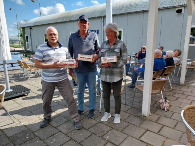 Gelukkig voor de mannen kende deze dag voor hen een beter resultaat dan de eerste dag. Immers, toen stonden er drie vrouwen op het erepodium, nu twee mannen en 1 vrouw. De prijzen werden door de winnaars met groot enthousiasme in ontvangst genomen, een heerlijke aardbeienschnitte en voor Ron als winnaar van poule A ook nog een fles wijn.